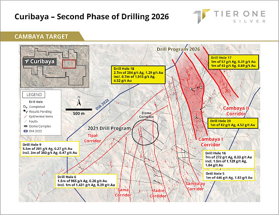 Peter Dembicki, CEO and President of Tier One commented, “Phase 2 drilling at Curibaya continues to validate a large, consistent high‑grade silver‑gold epithermal system across the Cambaya I corridor demonstrating vertical continuity and strike extension. Early Phase 2 results strengthen our regional geological model and suggest meaningful expansion potential, with indications from Phase 1 drilling that a potential copper-type system could be present in deeper zones nearby. With additional assays pending, and plans to significantly increase drilling capacity, we are increasingly confident in defining an important precious‑metals system and demonstrating Curibaya’s upside.”