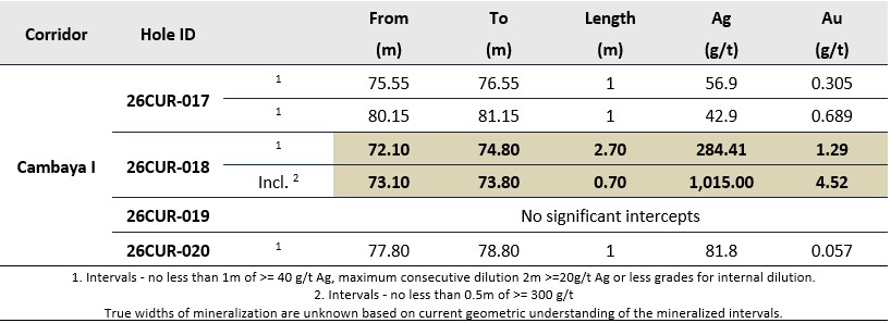 - 0.7 metres (“m”) of 1,015 grams per tonne (“g/t”) silver (“Ag”) and 4.52 g/t gold (“Au”), within a broader interval of 2.7 m of 284.4 g/t Ag and 1.29 g/t Au, in hole 26CUR-018, the second hole of Phase 2 drilling.