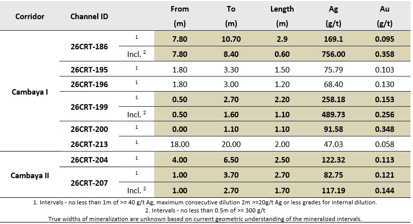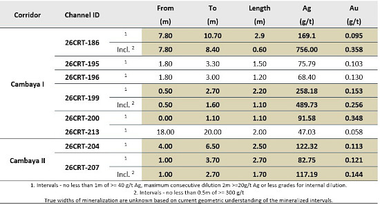 Table 2: Cambaya I and Cambaya II 2026 Channel Sampling Result Highlights