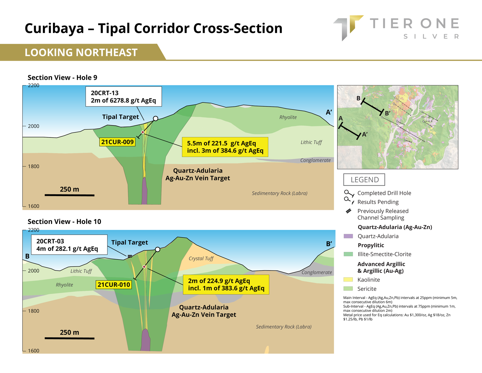 Vancouver, Canada – January 24, 2022 – Tier One Silver (TSXV: TSLV, OTCQB: TSLVF) (“Tier One” or the “Company”) is pleased to report results from drill holes 7 – 11 at the Curibaya project in southern Peru (Table 1). Hole 9 drilled 3 metres (m) of 384.6 g/t silver equivalent (AgEq) in a wider interval of 5.5 m of 221.5 g/t AgEq and was the first hole to target the Tipal structural corridor. This corridor is primarily defined by an airborne magnetics gradient that has a strike length of 2.5 kilometres (km) (Figure 1). The Tipal structural corridor represents the fourth corridor with confirmed silver-gold mineralization in the third dimension at Curibaya (Figures 1-2).